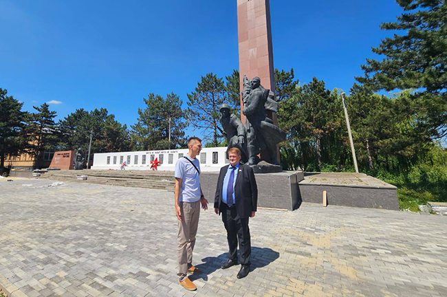 Депутат Госдумы Алексей Ткачёв и глава Алексеевского сельского поселения Николай Михайлов на общественной территории в центре станицы.