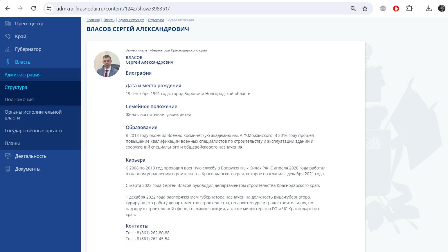 Власов родился в 1991-м, служил в Вооруженных силах РФ в 2008-2019 годах. В 2020-м устроился в администрацию Кубани. С декабря 2022 года чиновник стал заместителем губернатора и курировал департаменты строительства, архитектуры и градостроительства, надзора в строительной сфере, госжилинспекции, а также региональное Министерство гражданской обороны и чрезвычайных ситуаций.