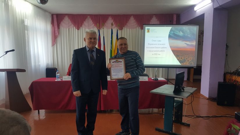 Председатель Совета муниципального образования Ейский район Олег Вяткин отметил эффективную работу главы поселения, выразил пожелание активнее участвовать в подготовке программ и проектов для привлечения средств из краевого и федерального бюджета. На открытой сессии он вручил благодарность за активную жизненную позицию и участие в общественной деятельности поселения индивидуальному предпринимателю Ивану Кайшеву, а также за активную работу в решении вопросов местного значения депутату Совета Моревского сельского поселения Сергею Виниченко.