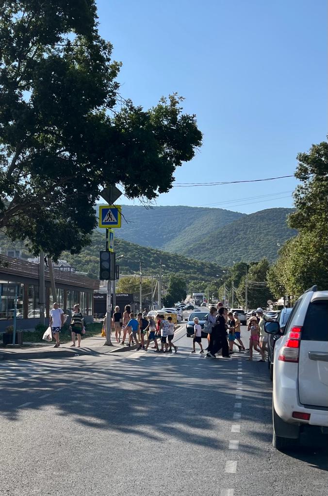 Поток людей на пешеходном переходе к морю и обратно не заканчивается весь световой день, да и вечером здесь достаточно оживлённо. Пешеходы блокируют движение, и в глухой пробке стоят автомобили от одного населенного пункта до другого.