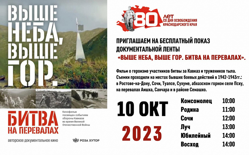 Показы документального фильма «Выше неба, выше гор. Битва на перевалах» также пройдут 10 октября в кинотеатрах Сочи. Сеансы: Центр культуры и кино «Комсомолец» в 10:00, «Сочи» в 12:00, «Луч» в 13:00, «Юбилейный» в 14:00, «Восход» в 14:00. Вход свободный. Фильм также будет демонстрироваться в домах культуры всех сельских округов города.