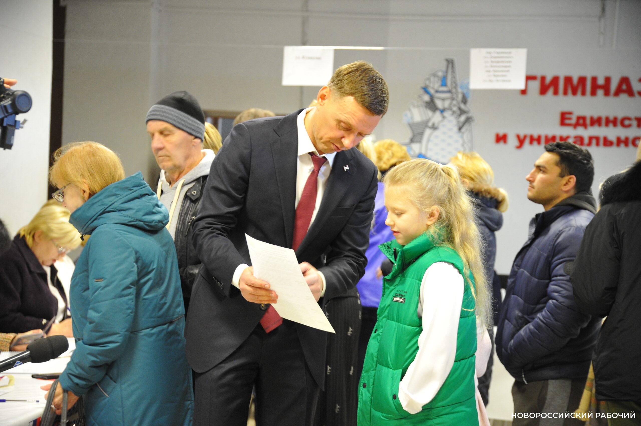 Фото Анатолия Позднякова. Глава Новороссийска, прибывший на избирательный участок всей семьей, объясняет средней дочери, как нужно заполнять бюллетень.В победе «кандидата номер один» мало кто сомневался (включая, по моему мнению, и его соперников на выборах). Жители страны давно симпатизируют Владимиру Путину, социологические опросы на протяжении многих лет показывают неизменно высокий уровень доверия к Президенту – от 70 до 80 процентов опрашиваемых.