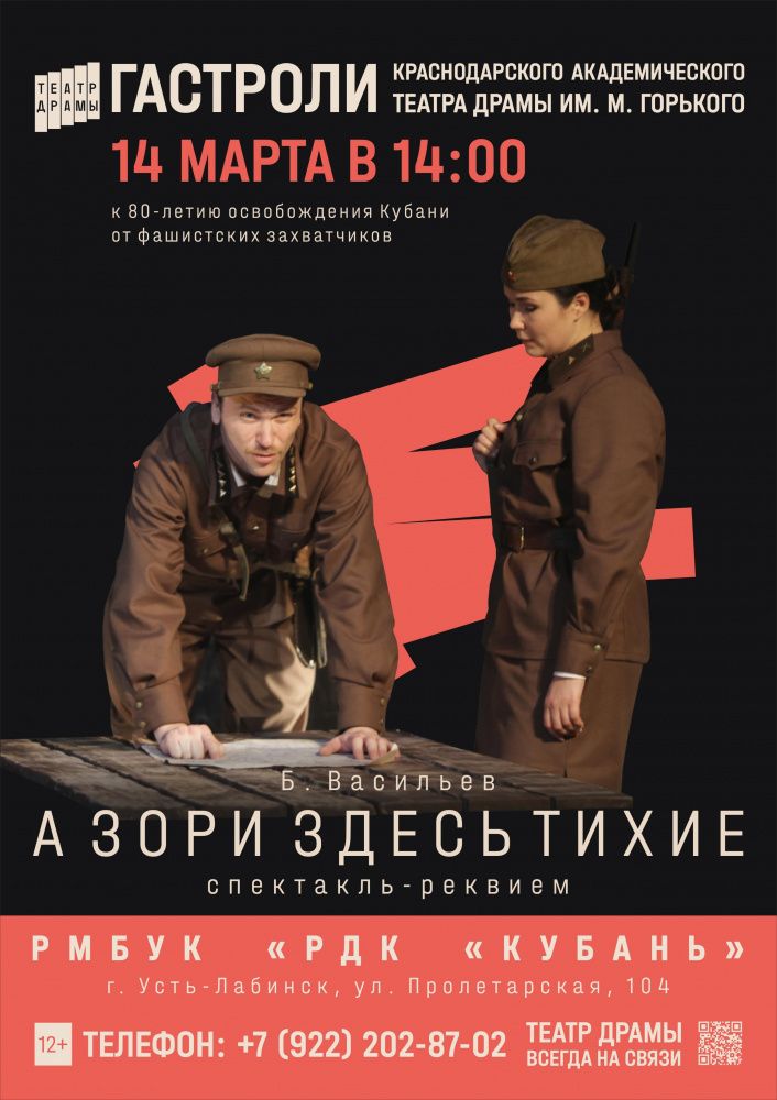 Спектакль усть-лабинским зрителям в РДК «Кубань» представит Краснодарский академический театр драмы имени Максима Горького. Спектакль поставлен по одноименной повести Бориса Васильева. Она рассказывает о судьбах пяти самоотверженных девушек-зенитчиц и их командира.