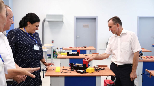 Вениамин Кондратьев осмотрел также кабинет труда для девочек — швейную мастерскую, оснащенную машинками, раскроечным столом, парогенераторами. Для мальчиков приготовили столярные мастерские с необходимым оборудованием для работы по дереву и металлу. Также Вениамин Кондратьев посетил кабинеты ОБЖ (основы безопасности жизнедеятельности) и кубановедения.