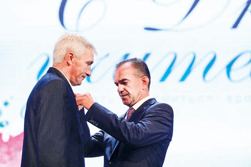 Награду от губернатора В. Кондратьева принимает О.Ю. Климов, учитель физической культуры СОШ № 2 им.