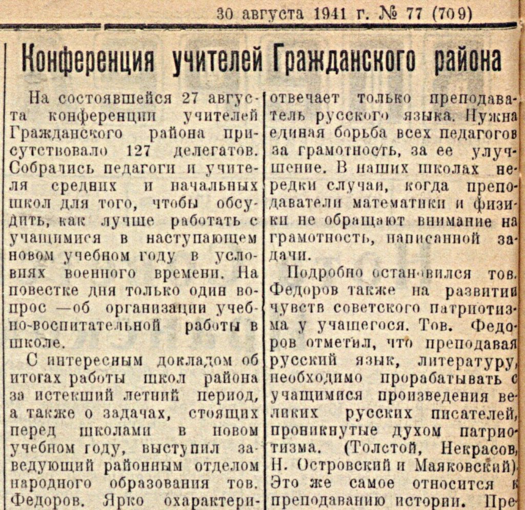 27 августа 1941 года в Гражданском районе прошла августовская учительская конференция. О том, что ей предшествовало, и как она завершилась, рассказала читателям районная газета «Вперёд», архивные выпуски которой хранятся в Российской государственной библиотеке.