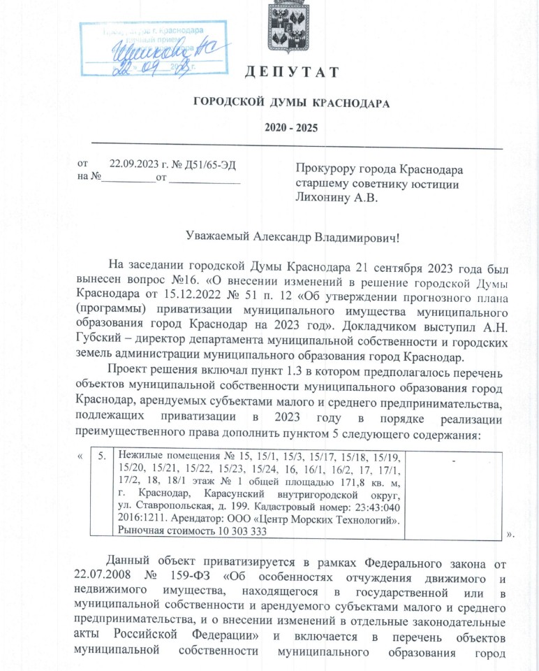 Ранее на заседании городской Думы фракция КПРФ требовала остановить приватизацию нежилого помещения в 170 квадратных метров по улице Ставропольской, 199. Мотивом этого требования стала недопустимо низкая цена приватизации: 59 тысяч рублей за квадратный метр, тогда как аналоги в том же районе стоят около 300 тысяч рублей.