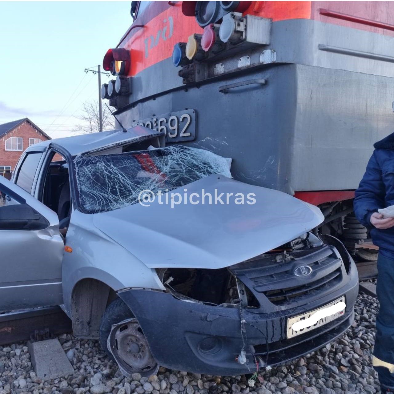 Последствия ДТП попали на видео Фото: телеграм-канал Краснодар №1. Телетайп В Краснодарском крае уже не молодой мужчина на следуя на автомобиле «Лада Гранта» погиб под поездом.