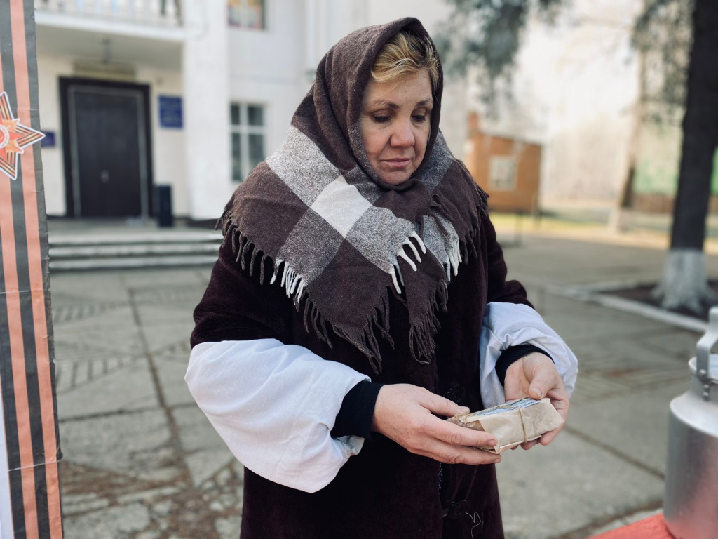 Волонтеры раздавали жителям села символичные кусочки хлеба весом в 125 граммов, памятные листовки и рассказывали о подвиге ленинградцев.