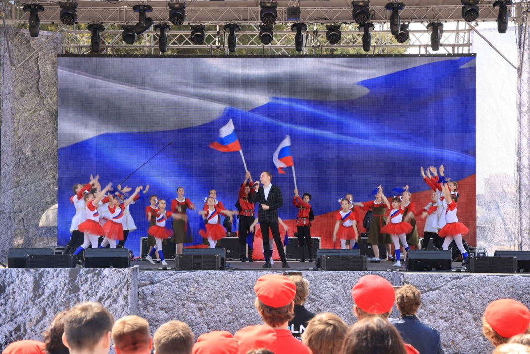 В 11.30 на Центральной площади открылось тематическое патриотическое мероприятие, центром которого стали школьники пяти территорий, носящих почетные звания «Город воинской доблести» и «Рубеж воинской доблести», жители и гости курорта.