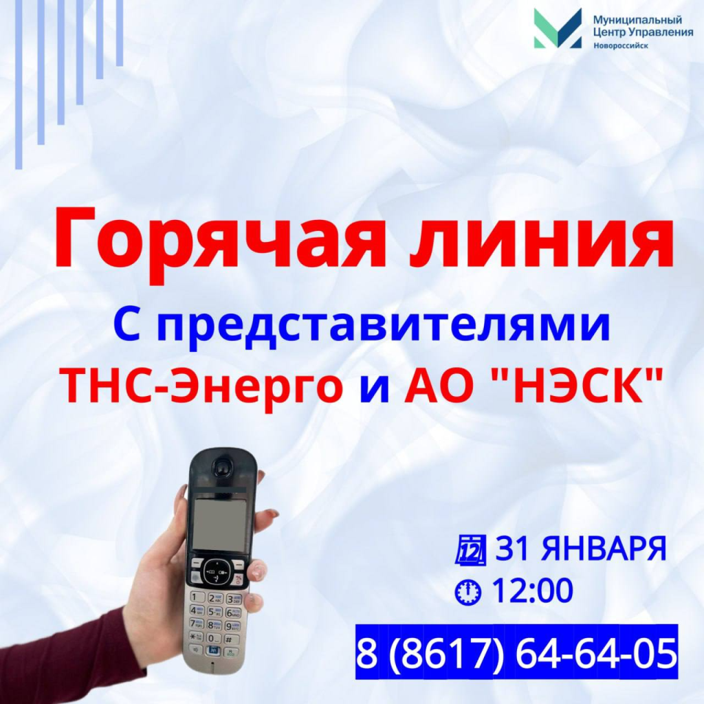 Уважаемые новороссийцы! Все ответы по новым дифференцированным тарифам потребления электроэнергии вы сможете получить на «горячей линии», которая пройдет 31 января с 12:00 до 13:00 в муниципальном центре управления.