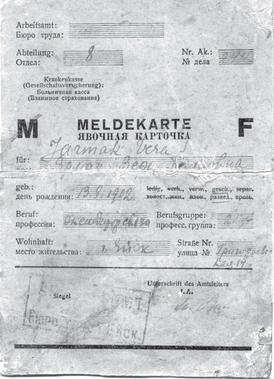В первые дни оккупации Ейска в городе была объявлена обязательная регистрация всех жителей . 19 августа 1942 года опубликован приказ городской управы, в соответствии с которым все люди в возрасте от 17 до 45 лет мобилизовывались «на восстановление разрушенного большевиками городского хозяйства». Всё трудоспособное население получило «явочные карты», по которым оно было обязано отмечаться на бирже труда. Горожане должны были ежедневно, кроме воскресений, являться на сборный пункт (площадь у Народного дома — ныне Театральная площадь) к 6 утра с продуктами питания на день. За неявку устанавливался штраф 100 рублей, за «злостное уклонение» — расстрел.