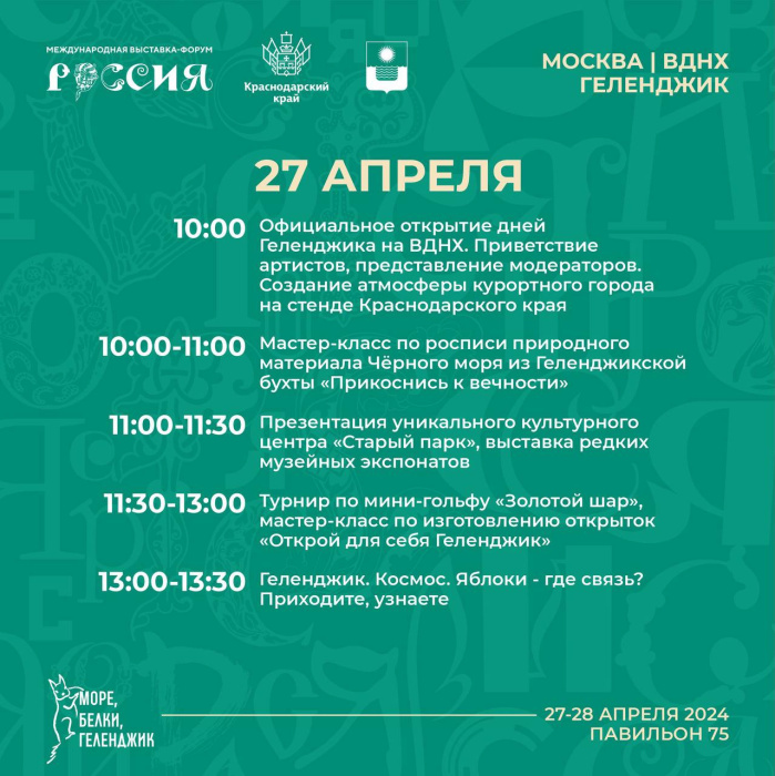 Ждем вас в павильоне N75 на ВДНХ в ближайшие выходные. Проведите их с Геленджиком - интересно и полезно! Все подробности в афише.