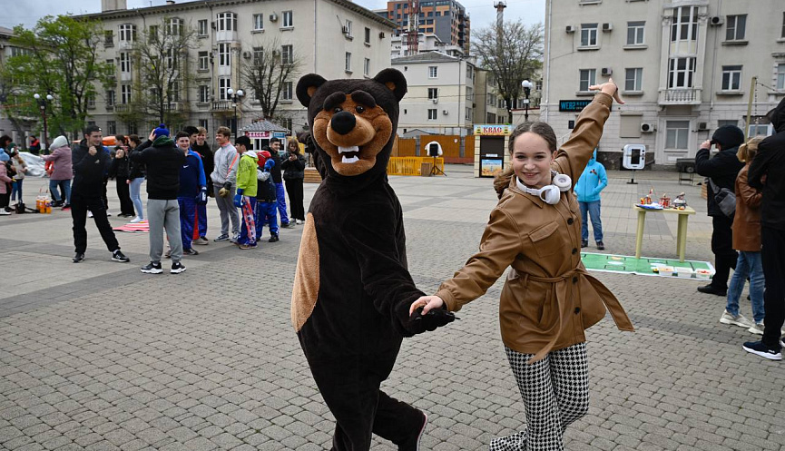 На главный городской праздник прохожих приглашают веселые ростовые куклы — в День Весны и Труда никто не должен остаться в стороне от всеобщего праздника.