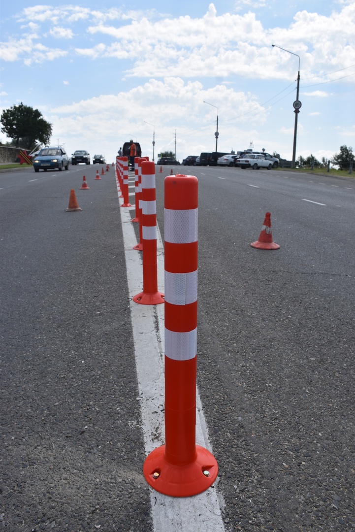 Сегодня специалисты МБУ «Общественно-социальный центр» в целях повышения обеспечения безопасности дорожного движения и исключения аварийных ситуаций начали обустройство двух островков безопасности разделяющих встречные транспортные потоки в районе музея «Военная горка» сигнальными дорожными столбиками.