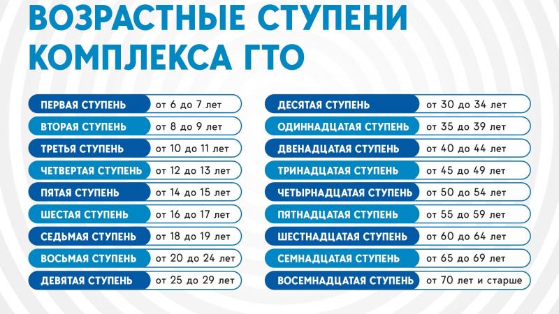 Всего установлено 18 возрастных ступеней с сокращённым временным отрезком между знаками отличия, как этого просили регионы и граждане в поступивших обращениях со всей страны. Согласно положению о комплексе ГТО, обновленные возрастные ступени разработаны и одобрены группой ученых из ВНИИФКа и Смоленского государственного университета спорта.