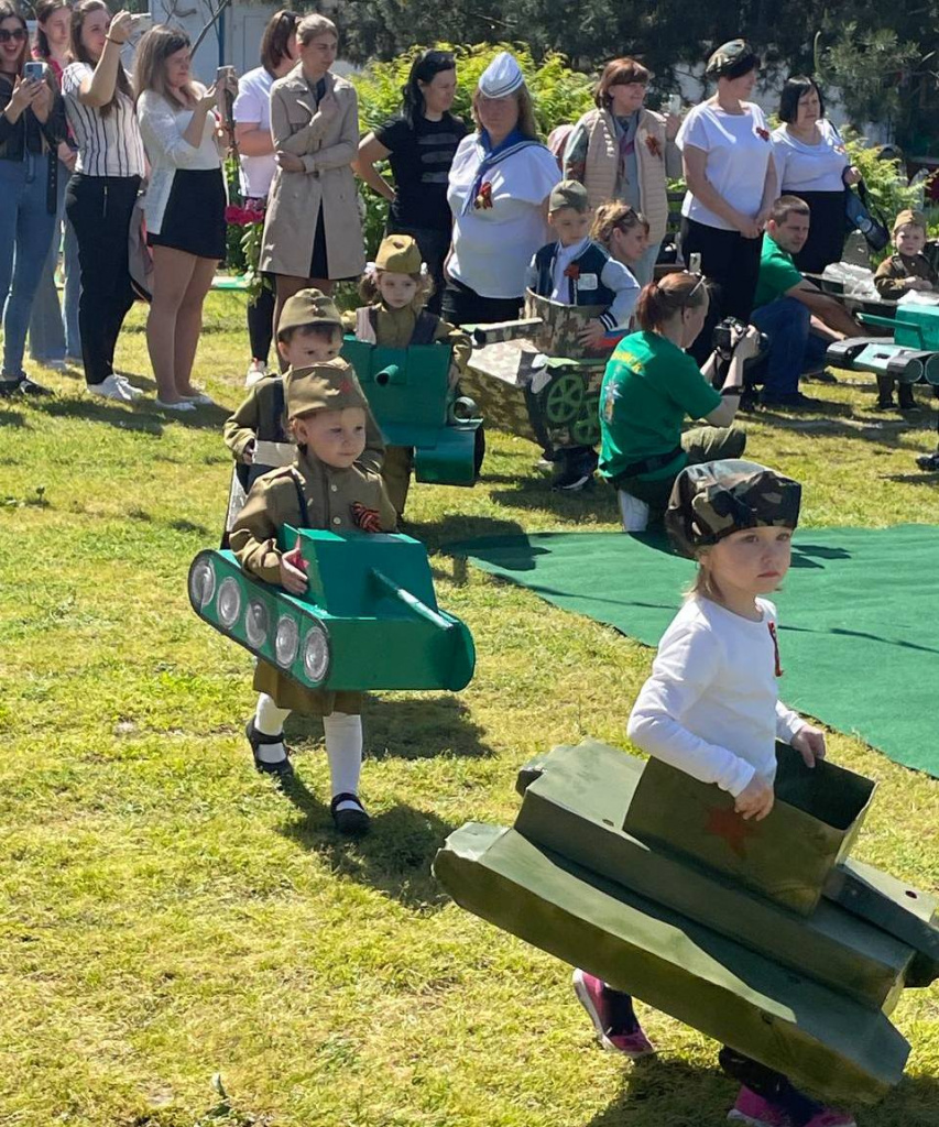 Дошколята устроили мини-парад импровизированных родов войск и устроили шествие бессмертного полка.