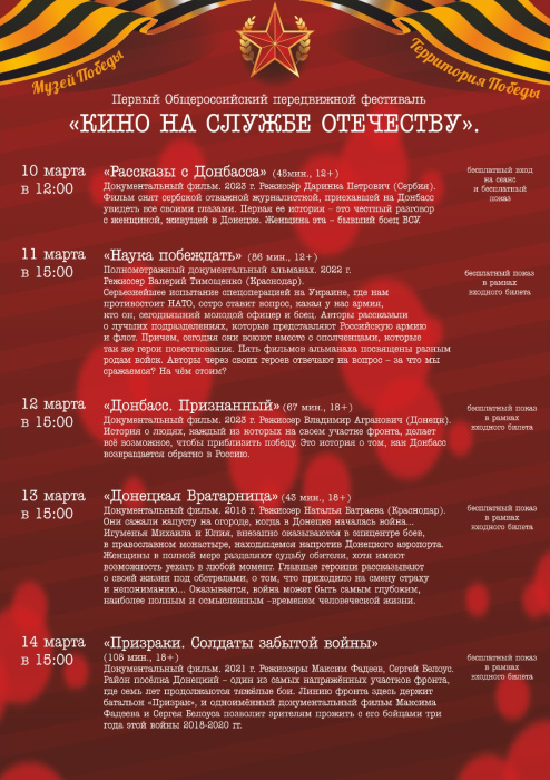 Музей Победы представляет на курорте Первый Общероссийский передвижной фестиваль. Ежедневные кинопоказы организованы в историко-краеведческом музее.