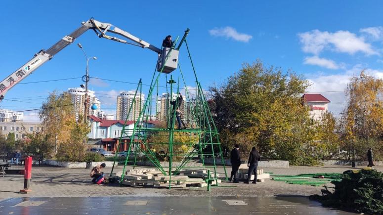 К монтажу первой ели приступили в сквере имени Гатова. Всего в городе появится девять искусственных ёлок. Их установку и украшение планируется завершить до 15 декабря.