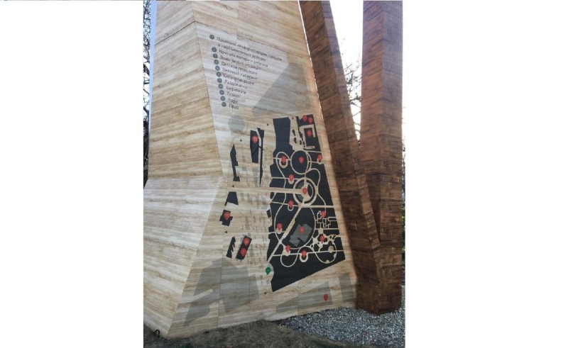 Навигационная карта была размещена на вертикальном элементе — входной группе со стороны ул. Толстого. Она помогает ориентироваться, рассказывает посетителям, что в парке много интересных мест, показывает их расположение.