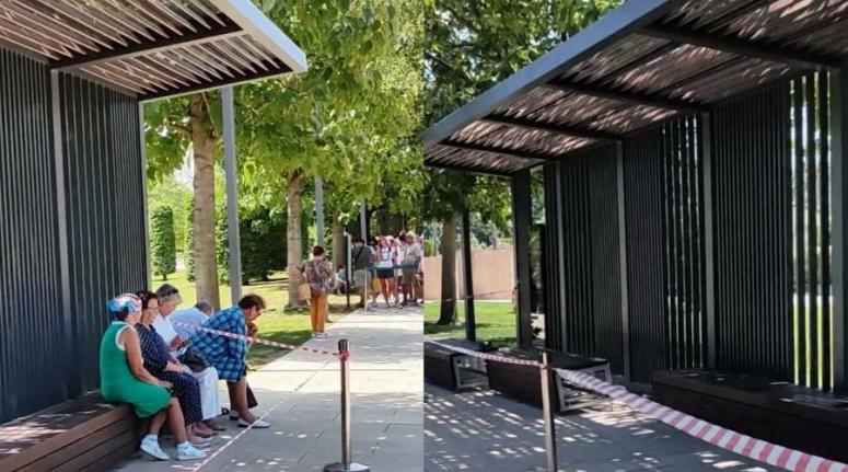 Возле входа в Японский сад рядом с инфоматами, выдающими QR-коды, появилась зона отдыха, предназначенная для посетителей, стремящихся попасть в заветную локацию. Лавочки с навесами, безусловно, будут востребованы гостями, многим из которых тяжело по несколько часов стоять в очереди на жаре.