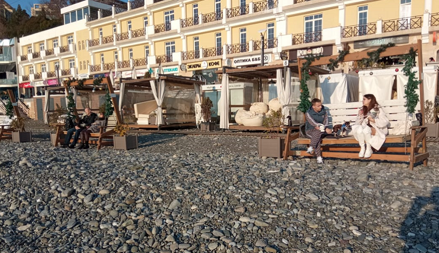 Сейчас на курорте работают 40 зимних пляжей. Заплатив 150 рублей, можно арендовать там «подушку» или качели-качалку, посидеть, отдохнуть, подышать морским воздухом и полюбоваться на закат. Либо, просто присесть на гальку (это бесплатно), что многие с удовольствием и делают.
