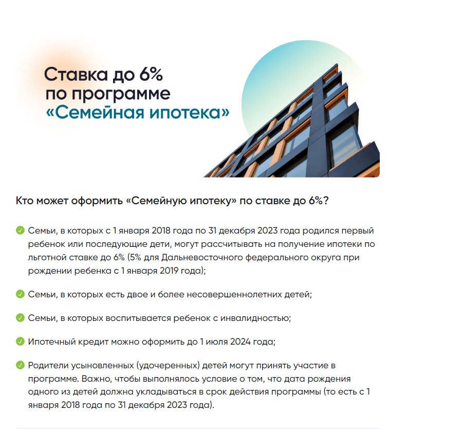 Подробности участия в программе «Семейная ипотека» смотрите в наших карточках, а также на сайте https://спроси.дом.рф/instructions/semeinaya-ipoteka/.