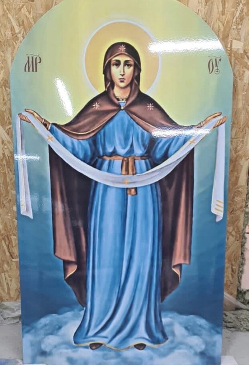 Фасад Шкуринского храма Покрова Пресвятой Богородицы украсила икона. Образ Божией матери нанесён на керамическую плиту размером 163 х 95 см.