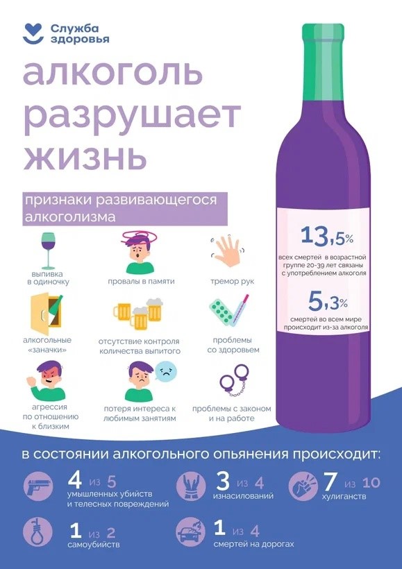 По данным ВОЗ (Всемирная Организация Здравоохранения), алкоголь является причиной более 200 различных нарушений здоровья. К ним относятся гипертония, инфаркт, гастрит, анемия, психические расстройства, рак, ВИЧ, СПИД, венерические и инфекционные заболевания и другие. А так же основную долю дорожно-транспортных происшествий и травм разного генеза.