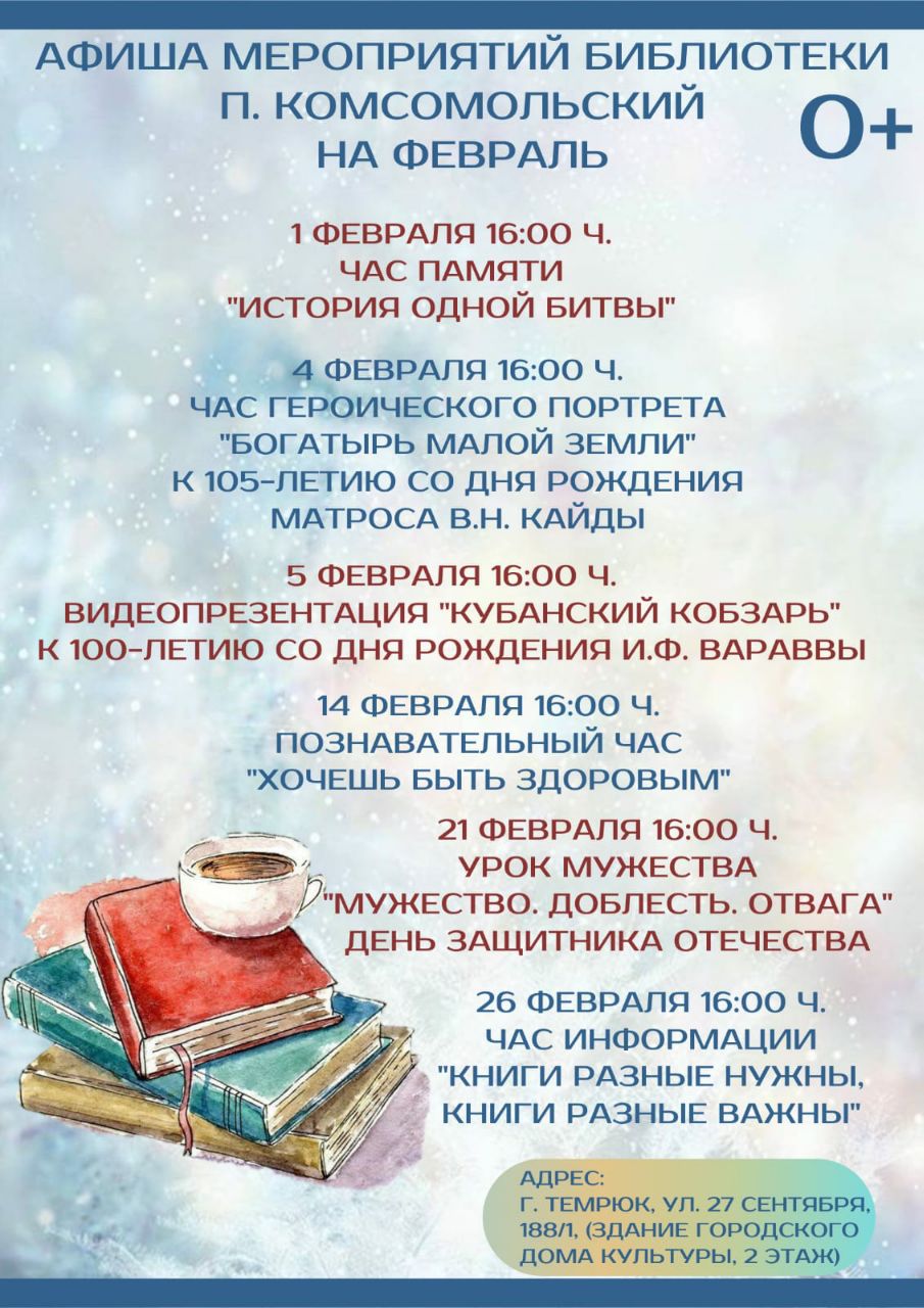 Уважаемые жители и гости города Темрюка, городские библиотеки приглашают Вас посетить мероприятия в феврале.